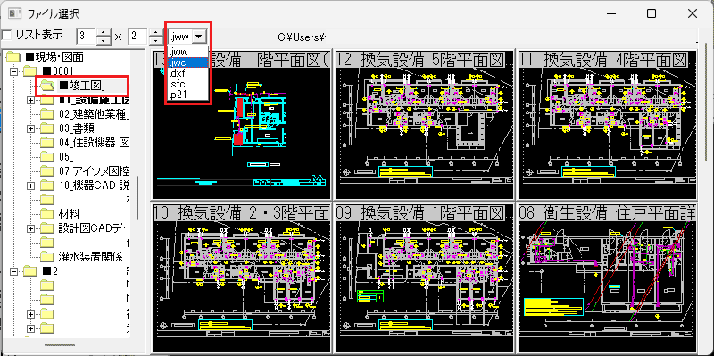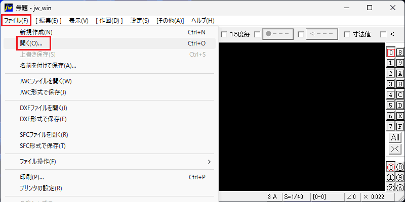 ◇[JWCファイルを開く]や[DXFファイルを開く]コマンドとの違いは、「ファイル選択」ダイアログがサムネール表示の時、ダイアログ左上部のファイルの種類が「.jww」であることである。ここを左クリック(L)して、他の形式のファイルを開くコマンドに切替えることができる。
